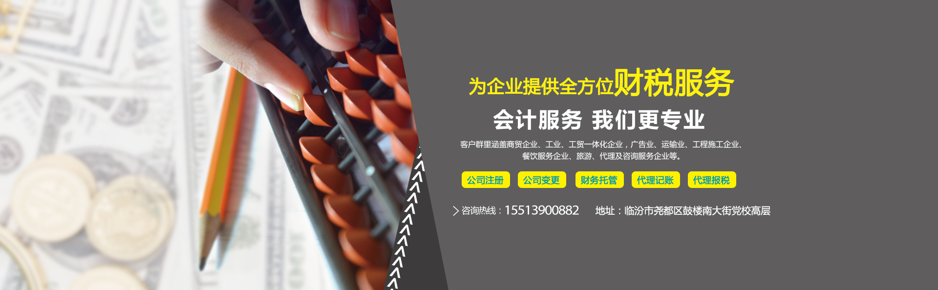 以專(zhuān)業(yè)的業(yè)務(wù)水平和豐富經(jīng)驗(yàn),為企業(yè)進(jìn)行公司注冊(cè)、公司變更、公司注銷(xiāo)、代理記賬、代理報(bào)稅、財(cái)務(wù)托管、財(cái)務(wù)咨詢(xún)、商標(biāo)注冊(cè)、驗(yàn)資審計(jì)等服務(wù)。
